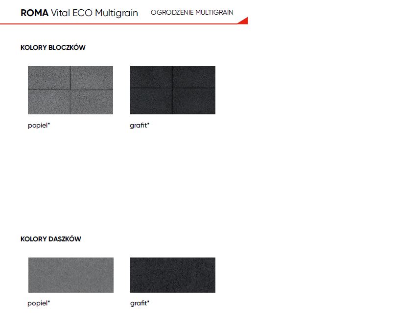 ROMA Vital ECO Multigrain to nowoczesne ogrodzenie firmy JONIEC®, które zapewni nietuzinkowy wygląd każdej posesji. Efekt „multigrain” nadaje powierzchni bloczków ogrodzenia subtelny grysowy wygląd. ROMA Vital ECO Multigrain to nieszablonowe ogrodzenie, które pozytywnie wyróżni się w otoczeniu innych domów. Dodatkową zaletą ogrodzenia jest innowacyjna konstrukcja bloczków, która pozwala obniżyć koszty budowy i skrócić czas montażu.