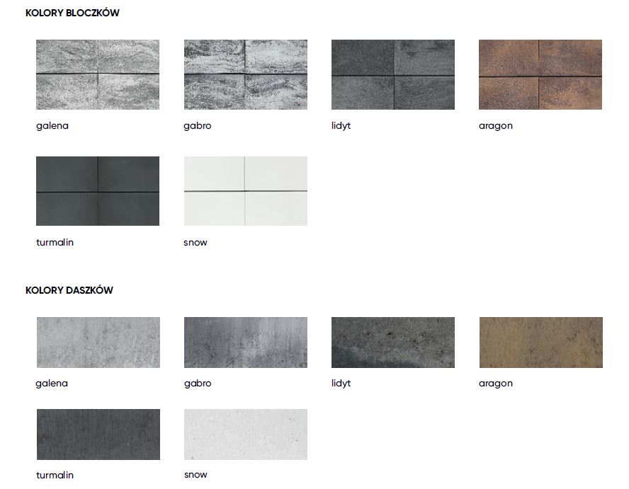 - Kolory dostępne: galena, gabro, lidyt, aragon, turmalin, snow