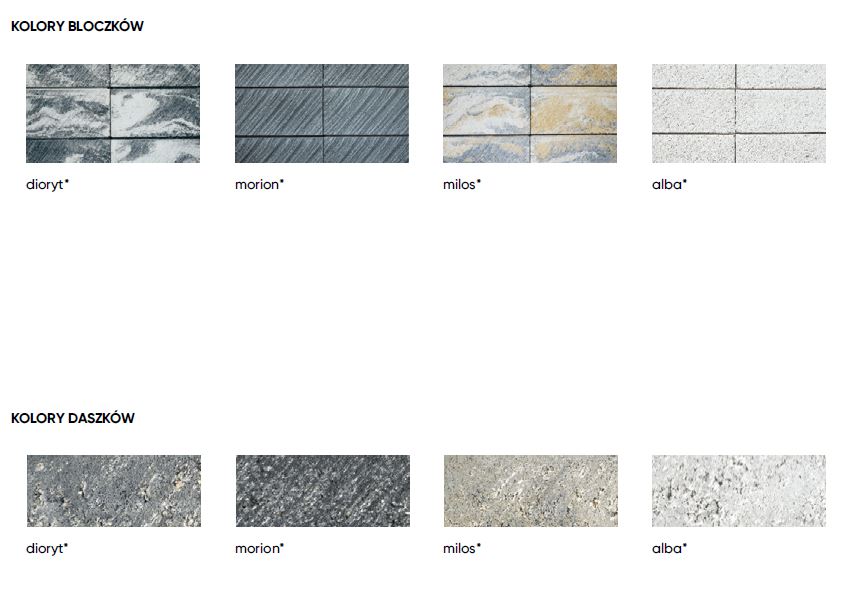- Kolory dostępne: milos, dioryt, morion, alba